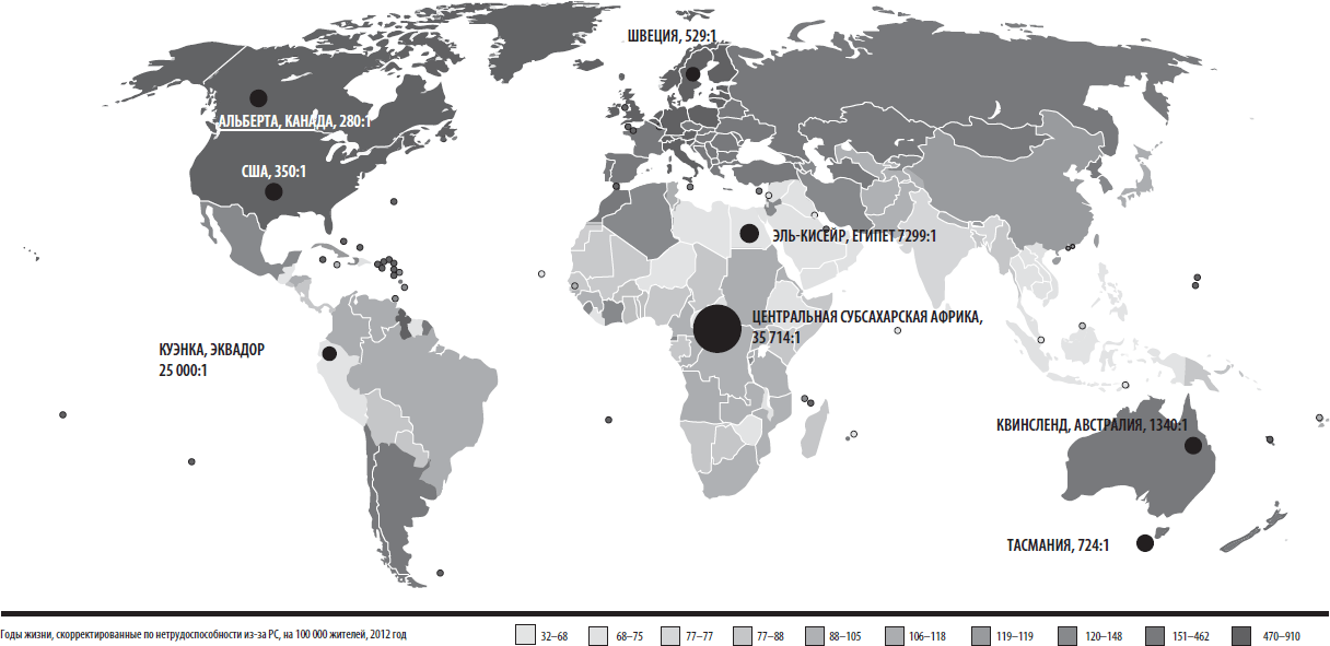 РИСУНОК 1.5. РИСК РАЗВИТИЯ РС В ОТДЕЛЬНЫХ РЕГИОНАХ: ЦЕНТРАЛЬНОЙ АФРИКЕ [24], ЭЛЬ-КИСЕЙРЕ (ЕГИПЕТ) [25], АЛЬБЕРТЕ (КАНАДА) [26], КУЭНКЕ (ЭКВАДОР) [17], КВИНСЛЕНДЕ (АВСТРАЛИЯ) [27], ШВЕЦИИ [28], ТАСМАНИИ (АВСТРАЛИЯ) [27], США. ИЛЛЮСТРАЦИЯ НА ОСНОВЕ МАТЕРИАЛОВ WIKIMEDIA COMMONS