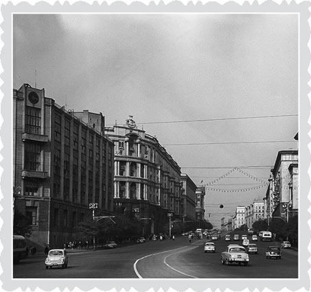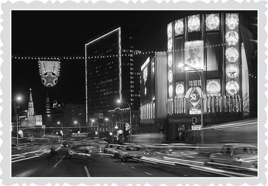 Ночной вид телеграфа на 7 ноября. И товарищ Ленин, подглядывающий в праздники в окна к Кате. А чуть дальше по улице скудно освещенная гостиница «Интурист»