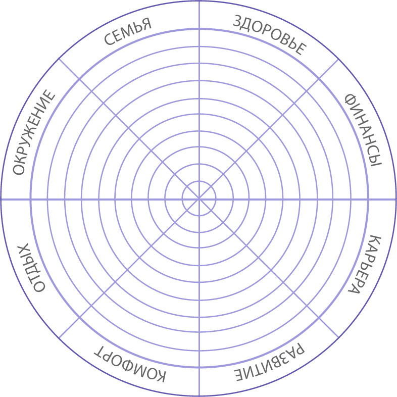 Оцените развитость каждой сферы по шкале от 0 до 10 и закрасьте сегменты колеса в соответствии с баллами. Чем выше балл, тем больше сегмент по площади.