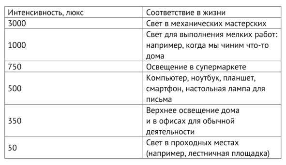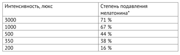 Интенсивность источника также играет роль. Любой свет интенсивностью 180—200 люкс вреден для сна.