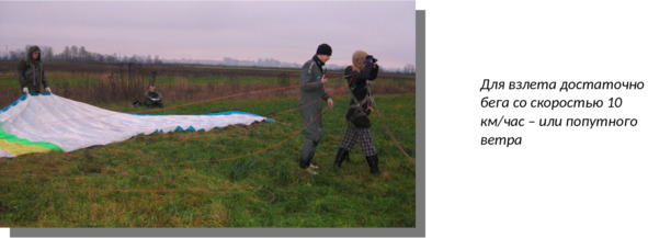 Когда все готово, лебедка начинает крутиться и тянуть вас вперед. Вы должны бежать за ней по полю (на деле бег получается, как в замедленной съемке) до тех пор, пока купол за вашей спиной не наполнится воздухом. В какой-то момент купол поднимется вверх и оторвет вас от земли. Это всегда происходит очень быстро и неожиданно. Только что вы бежали по земле – и вот уже пытаетесь бежать по небу, перебирая ногами в воздухе.