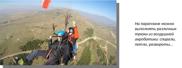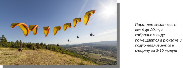 • Если к параплану прибавить мотор в виде пропеллера, который парапланерист надевает себе на спину как Карлсон, получится мотопараплан – более независимый летательный аппарат.