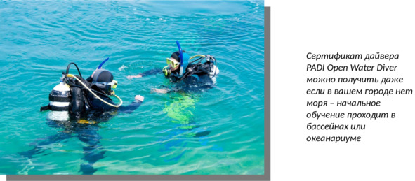 Результат после 2—3 месяцев: если вы решитесь пройти первый этап обучения, то получите сертификат PADI Open Water Diver, дающий право самостоятельных погружений до глубины 18 метров. Обучение состоит в среднем из 5 теоретических +5 практических занятий в бассейне +4 погружений в «открытой воде». В вашем городе нет моря? Не беда, дайвинг-клубы проводят погружения в том числе в озерах или организуют выезды на Черное и Красное моря.