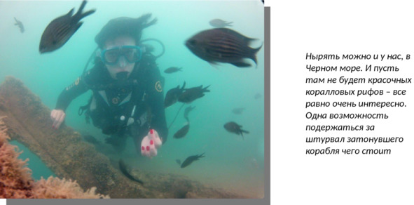 Я покормила рыбок с руки, посмотрела на угрюмого краба, потрогала заросший водорослями штурвал затонувшего корабля… и даже постояла на дне морском, сплошь усыпанном ракушками. Правда, если бы не инструктор, который все время держал меня за руку, мне ни за что бы не удалось принять вертикальное положение. Возвращение к свету и воздуху спустя 30 минут было особенно радостным… Мы поднимались по той же веревке, и вокруг становилось все светлее!