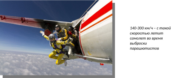 • Человек, выскочивший из самолета, будет падать вниз со скоростью 180 км/ч. До тех пор, пока не раскроется парашют.