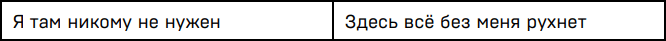 Лейтмотив этих двух утверждений – социальная значимость. Боязнь оказаться ненужным, неподходящим, неуместным в некотором «там». И, наоборот, уверенность в том, что вы сверхнеобходимы в конкретном и хорошо знакомом «здесь».