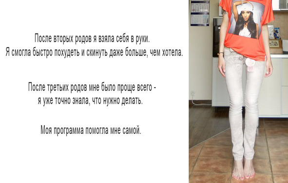 Когда я родила третьего сына, многие знакомые принялись заваливать меня вопросами – как мне удалось сохранить фигуру, почему я не стала толстой и дряблой, какими секретами я пользуюсь, и так далее. В конце концов, я устала отвечать всем одно и то же, и решила просто выложить свой принцип похудения в виде книги.