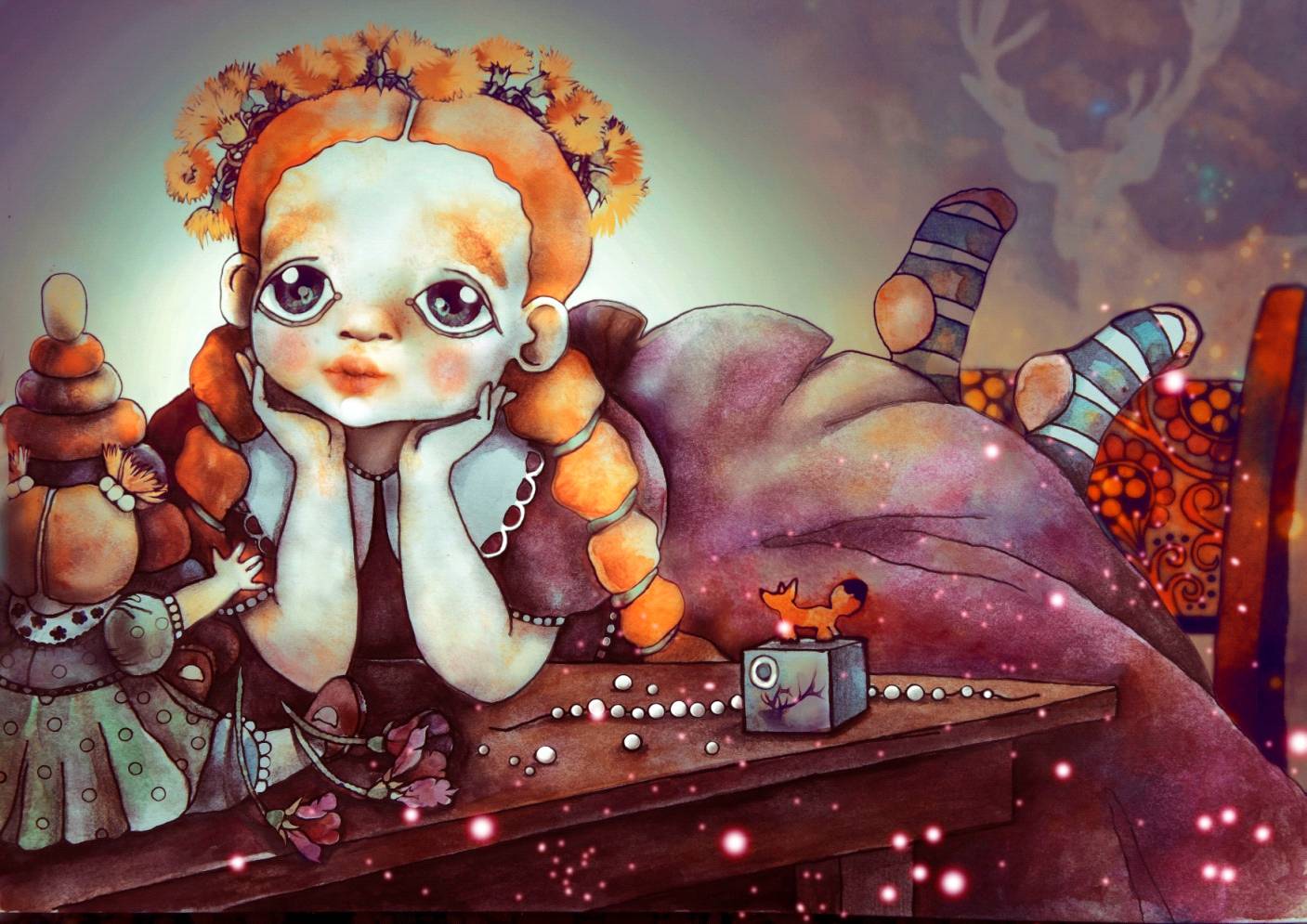 Десятки коробок, ящиков, вековая серо-золотая пыль, вышитые занавески на окне с видом на лес, шкатулочки, тканые половики и кривенькие стопки открыток и газет. Среди этих сокровищ я наткнулась на плетеную зыбку, в которой мирно дремала винтажная коробка с коричневым атласным бантом и нарисованным от руки Оленем.