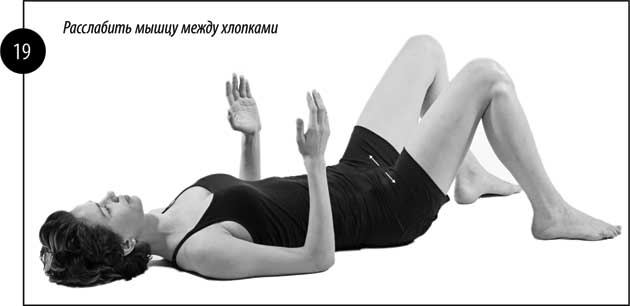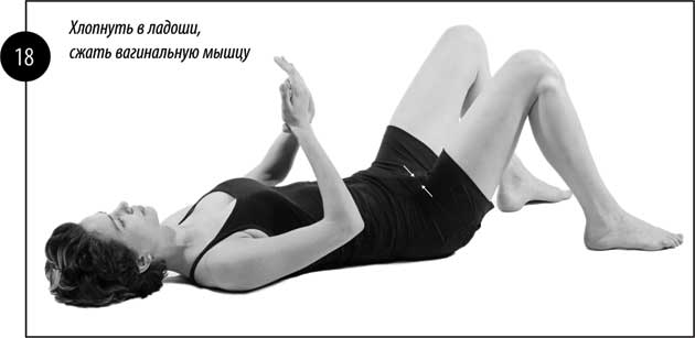 Упражнение выполняется в исходном положении лежа, руки сложены, как для аплодисментов, ноги слегка согнуты и раздвинуты в стороны. Начинаем сильно хлопать в ладоши, одновременно начинаем сильно сжимать вагинальную мышцу, как это показано на рисунках 18 и 19. Продолжительность выполнения упражнения две-три минуты.