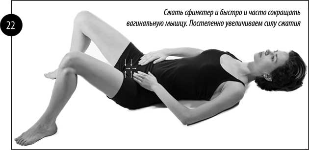 Упражнение выполняется в исходном положении лежа, руки внизу живота, ноги слегка согнуты и раздвинуты в стороны. Спокойно считаем до восьми и в обратном порядке. На счет «один» вы немного сжали вагинальный сфинктер, то есть ввели в тонус. На счет «два» плавно сжали мышцу посильнее и так же плавно подтянули ее немного кверху. На счет «три» еще сильнее сжали и подтянули, на счет «четыре» еще сильнее, на счет «пять» еще сильнее, на счет «шесть» еще сильнее, на счет «семь» и «восемь» дожимаем «до конца» и сильно, но очень плавно подтягиваем мышцу кверху, как это показано на рисунке 20. И сразу же начинаем расслаблять мышцу считая от восьми до одного в обратном порядке. На счет «семь» немного ослабили нагрузку но мышца еще очень сильно сжата, на счет «шесть» мышцу еще немного расслабили, на счет «пять» еще расслабили, на счет «четыре» еще расслабили, на счет «три» еще расслабили, на счет «два» мышца просто находится в тонусе. На счет «один» плавное и умеренное выталкивание книзу, как это показано на рисунке 21. Повторить упражнение без остановки 10 раз.