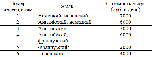 Для обслуживания международного семинара необходимо собрать группу переводчиков. Сведения о кандидатах представлены в таблице.