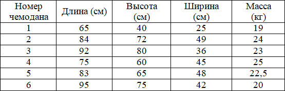 По правилам авиакомпании сумма трёх измерений (длина, высота, ширина) чемодана, сдаваемого в багаж, не должна превышать 203 см, а масса не должна быть больше 23 кг. Какие чемоданы можно сдать в багаж по правилам этой авиакомпании? В ответе укажите номера всех выбранных чемоданов (без пробелов, запятых и других дополнительных символов).
