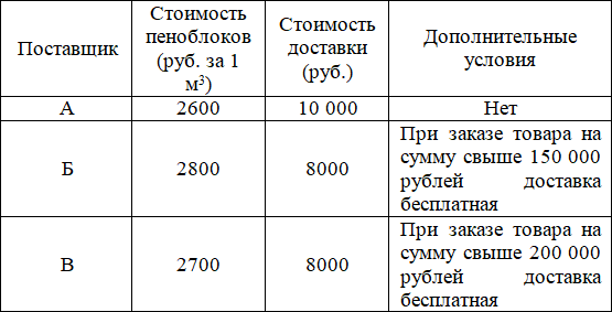 Строительная фирма планирует купить 70 м3 пеноблоков у одного из трёх поставщиков. Цены и условия доставки приведены в таблице.