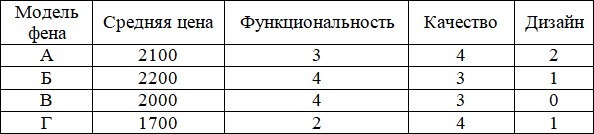Поочерёдно вычислим рейтинг каждого представленного в таблице фена: