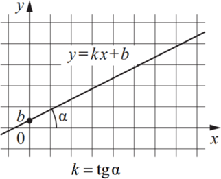 Линейная функцияЛинейная функция (прямая) имеет вид y = kx + b, где k – угловой коэффициент, который характеризует угол, который образует прямая y = kx + b положительным направлением оси Ох. Если k > 0, то этот угол острый; если k < 0, то – тупой; если k = 0, то прямая параллельна оси Ох или совпадает с ней.