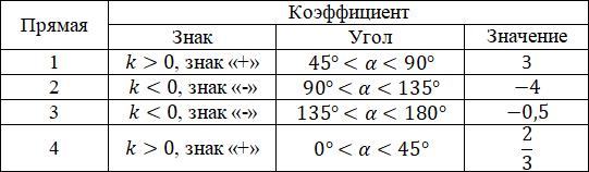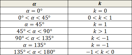 Также для удобства составим таблицу, которая будет демонстрировать зависимость коэффициента k от угла наклона прямой: