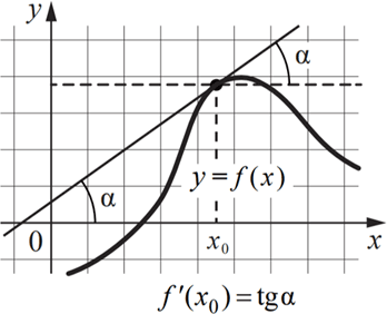 Значение производной функции y = f(x) в точке x0 равно угловому коэффициенту касательной, проведенной к графику функции в точке с абсциссой x0: