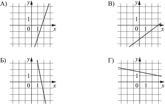 На рисунках изображены графики функций вида y = kx + b. Установите соответствие между графиками функций и значениями их производной в точке x = 1.