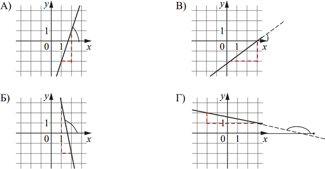 Г) k = 1/5 = 0,2, так как 135° < α < 180°, – 1 < k < 0, следовательно k = –0,2