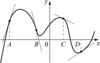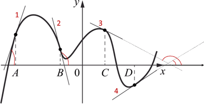 На рисунке изображены график функции и касательные, проведённые к нему в точках с абсциссами A, B, C и D.