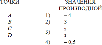 В правом столбце указаны значения производной функции в точках A, B, C и D. Пользуясь графиком, поставьте в соответствие каждой точке значение производной функции в ней.