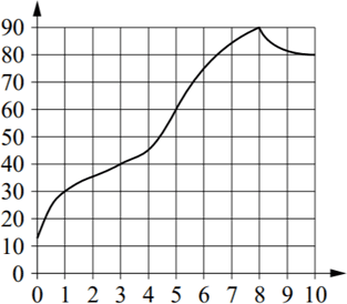 На графике изображена зависимость температуры от времени в процессе разогрева двигателя легкового автомобиля. На горизонтальной оси отмечено время в минутах, прошедшее с момента запуска двигателя; на вертикальной оси – температура двигателя в градусах Цельсия.