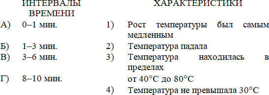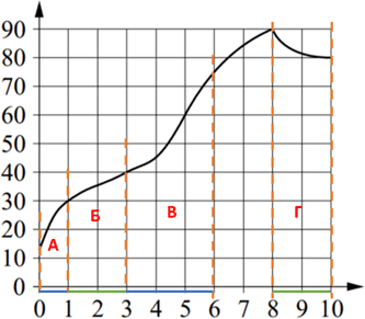 Таким образом, очевидно, что на интервале А температура не превышала 30°C, на интервале Б рост температуры был самым медленным, на области В температура находилась в пределах от 40°C до 80°C, а в области Г температура падала.