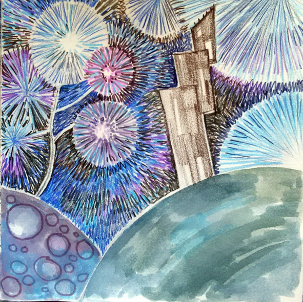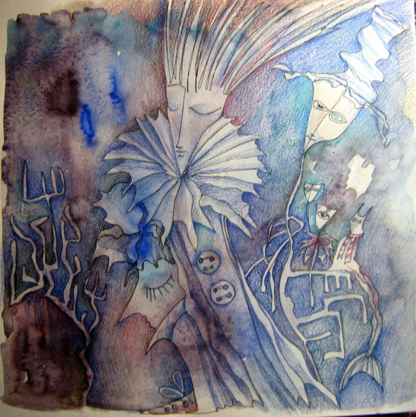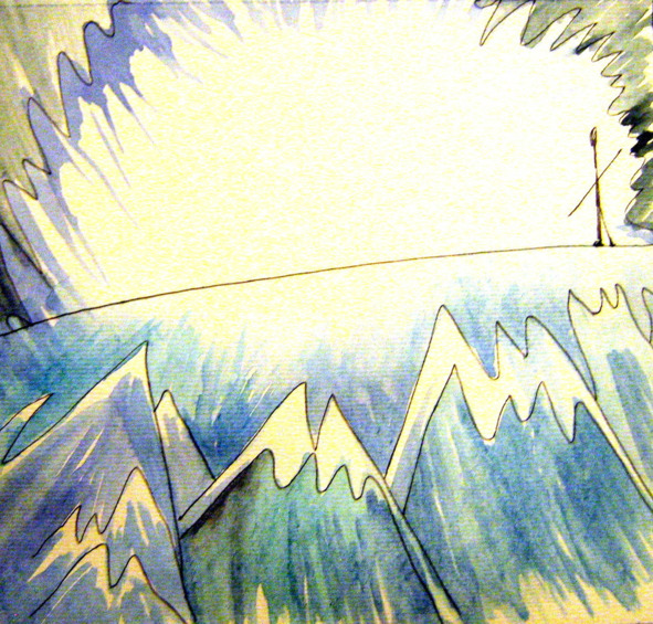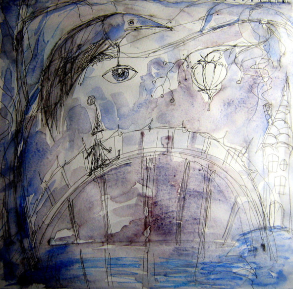 Мальчик стоял на берегу бурной реки и грустно смотрел на противоположную сторону. Там, на другом берегу, виднелась какая-то тень, машущая руками (сестра или мама?) А также – силуэт дома. С дымом, поднимающимся из трубы.