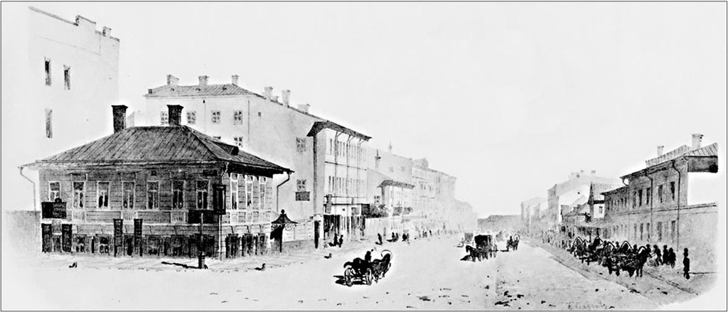 Каменные и деревянные доходные дома на перекрестке Надеждинской и Бассейной улиц (ныне – Маяковского и Некрасова). Акварель Ф.Ф. Баганца. 1860-е гг.