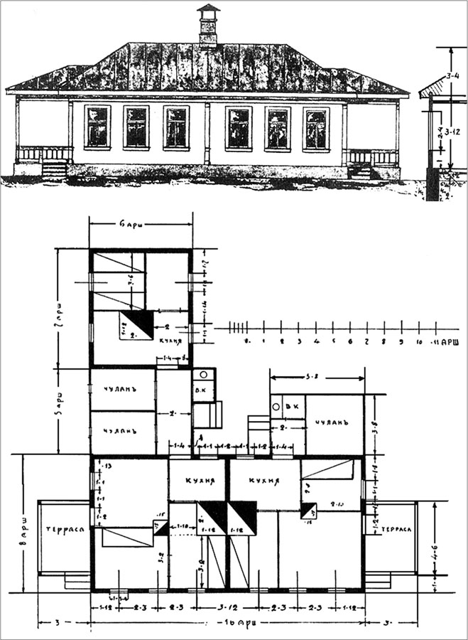 Одноэтажный доходный дом, оштукатуренный, на две трехкомнатные квартиры, посередине – пилястра, закрывающая концы бревен. Альбом проектов Г.М. Судейкина. 1916 г.