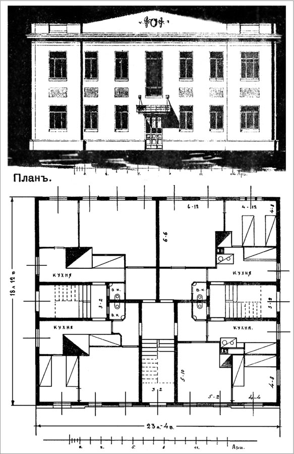 Проект двухэтажного доходного дома размером 12 × 16 метров: 8 двухкомнатных квартир, теплый ватерклозет, кухня с уголком для постели прислуги. Каждая квартира имеет парадный и черный ходы. Альбом проектов Г.М. Судейкина. 1916 г.