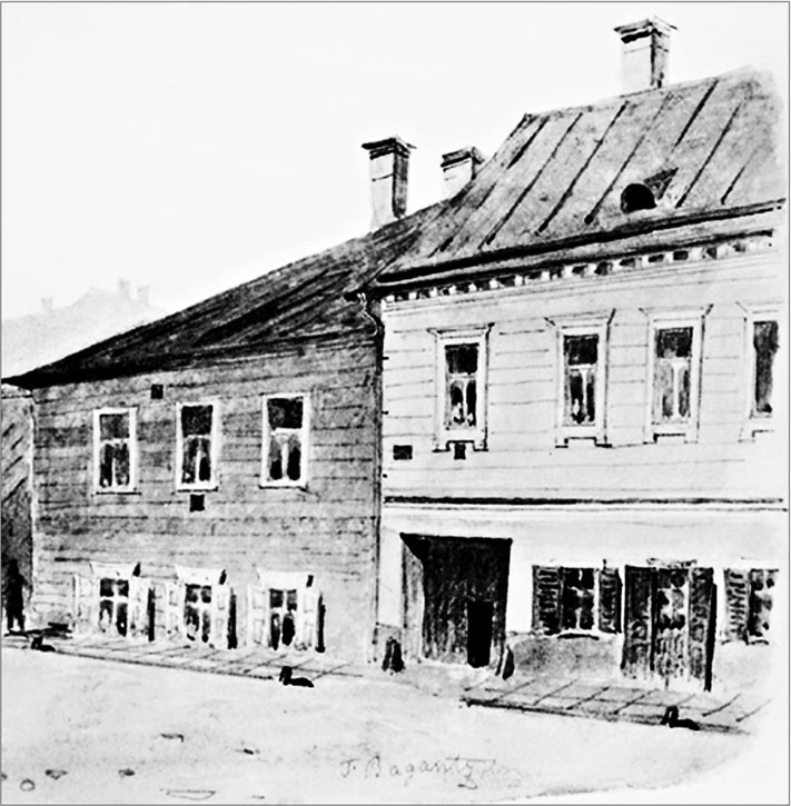 Смешанный дом: первый этаж – каменный, а второй – деревянный на Малой Итальянской. Акварель Ф.Ф. Баганца. 1860-е гг. Фрагмент