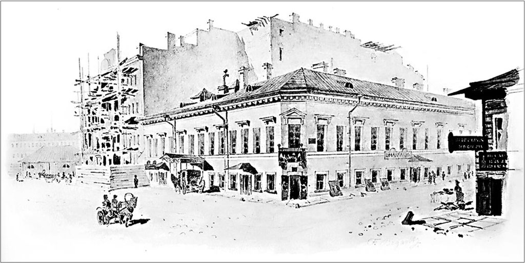 Строительство доходного дома на углу Литейного проспекта и Бассейной улицы (ныне – ул. Некрасова). Акварель Ф.Ф. Баганца. 1860-е гг.