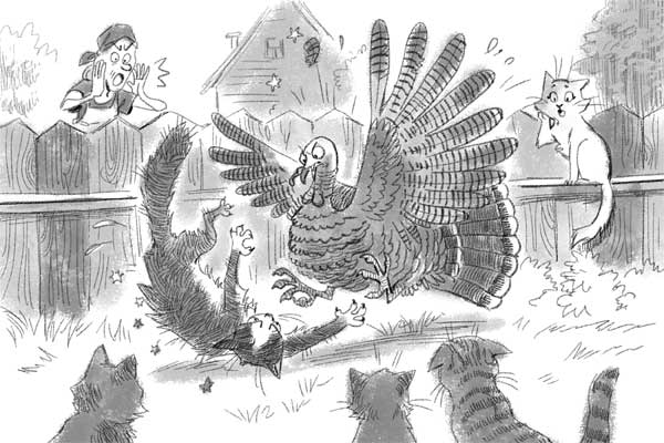 Вдруг сзади Федьки зашипел кто-то. Я знаки Федьке делаю, мол, оглянись. А он отмахивается. Тут хозяйка из окна аж выгнулась, как закричит: «Кыш, уходи!» Все коты разбежались, а Федька в непонятках. Тут он оглянулся и встретился глазами с шипуном этим. А то оказался индюк. Перелетел от соседки и давай тут нам вечер портить. Крыльями машет, кулдыкает и шипит, как змея.