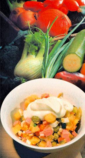 Картошка не должна преобладать! Итак, картошка, морковка, яйца, горошек, вареное мясо или курица, или крабы, а можно только овощи. Немного каперсов, зеленый лук, укроп, петрушка. Однажды папу послали на рынок за зеленым луком, но он принес лук-порей. Мы попробовали и с тех пор клали только порей! Все мелко порезать, смешать… Ах да, я забыла про огурцы. Можно соленые, можно маринованные, а можно те и другие и, разумеется, свежий огурчик. В моем детстве свежих огурцов зимой не было, в молодости можно было, например, к Новому году за бешеные деньги купить один маленький огурчик на рынке, «для запаха». Итак, все перемешайте, посолите, добавьте черный перец и обязательно чайную ложку сахара и майонез. Некоторые кладут в салат еще яблоко, но я это терпеть не могу. Кстати, укроп и петрушка тоже позднейшее дополнение.