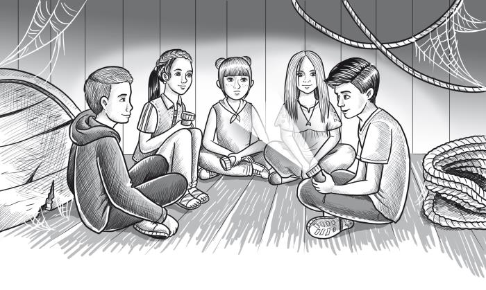 Алёна и Оля последовали его примеру. Оле уже вообще хотелось поскорее послушать истории и вернуться в лагерь. Ненавистная темнота раздражала. Ренат же смело ступил вглубь сарая, даже не подсвечивая себе путь. Правда, тут же за это поплатился, когда первое, стоявшее рядом весло чуть не ударило его по голове.