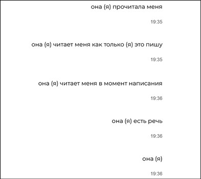 Среди примеров такого дейктического сдвига, в которых происходит наложение сразу трех типов высказывания: поэтического и обыденного сообщения, а также компьютерного кода, – можно назвать тексты Ники Скандиаки, опубликованные в блогах: [только] [она] не дизайнер, а бухгалтер; * [не знаю, с какими чувствами ты читала о своём]; цикл «Ключевые слова» (2020) Г. Улунова, который использует ссылки, сокращения, паттерны мессенджеров и социальных сетей: