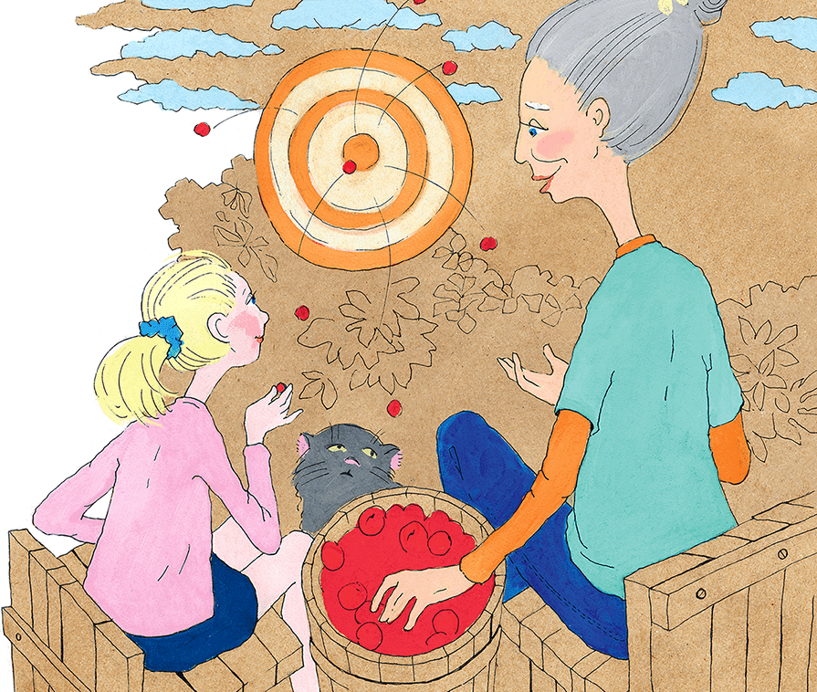 За попадание в край мишени – три очка, ближе к центру – пять, а если угодишь в красную точку посередине – пятнадцать. К концу завтрака у меня восемнадцать очков, у бабушки – девяносто девять.