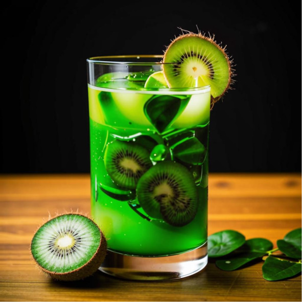 Смешивание: В блендере соедините все ингредиенты и взбивайте до однородности. Подача: Разлейте по стаканам и украсьте дольками киви.