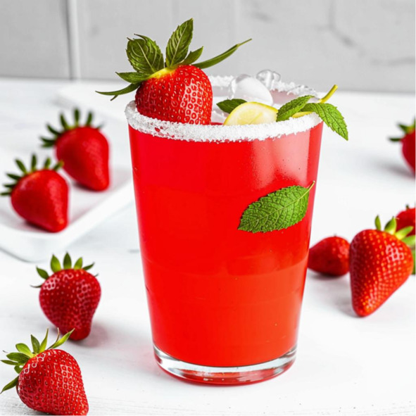 Смешивание: В блендере соедините клубнику, йогурт, мяту и лед, взбивайте до однородности. Подача: Разлейте по стаканам и украсьте клубникой и мятой.