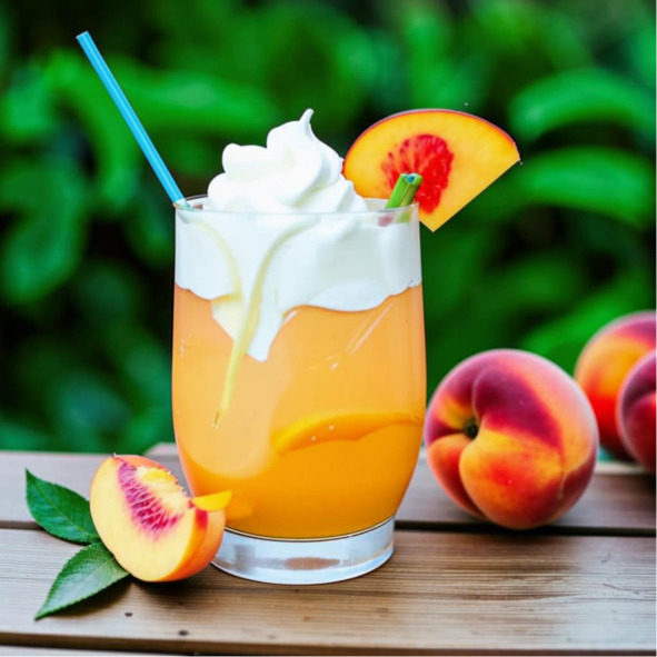Смешивание: Поместите все ингредиенты в блендер и взбивайте до однородности. Подача: Разлейте по стаканам и украсьте дольками персика.