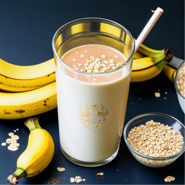 Замачивание овса: Замочите овсяные хлопья в молоке на 10—15 минут. Смешивание: В блендере смешайте все ингредиенты до однородности. Подача: Разлейте по стаканам и подавайте сразу.