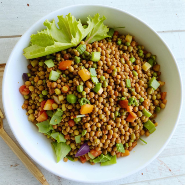 Смешай все ингредиенты в миске. Заправь оливковым маслом и лимонным соком. Перемешай и подавай.