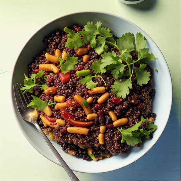 Промой киноа и отвари ее в 2 стаканах воды 15 минут. Смешай готовую киноа, черные бобы и нарезанные овощи. Заправь соком лайма, посоли и поперчи.