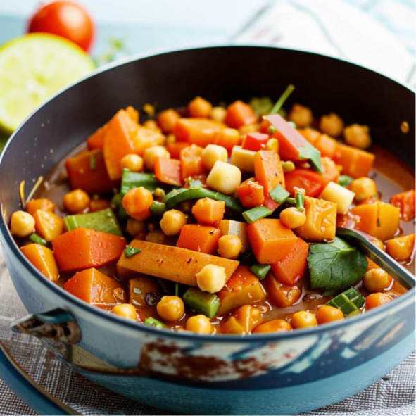 На сковороде разогрей оливковое масло. Обжарь нарезанный лук до прозрачности. Добавь нарезанные морковь, баклажан и цукини. Обжаривай 5—7 минут. Добавь нут, куркуму, соль и перец. Готовь еще 10 минут, помешивая.