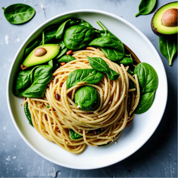 Отвари спагетти согласно инструкции. В блендере смешай авокадо, шпинат, чеснок, лимонный сок, соль и перец до однородной массы. Смешай отваренные спагетти с соусом и подавай.