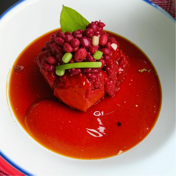 На сковороде разогрей кунжутное масло. Обжарь лук и чеснок до прозрачности, добавь нарезанный болгарский перец. Добавь фасоль, помидоры, паприку, соль и перец. Туши 15 минут.