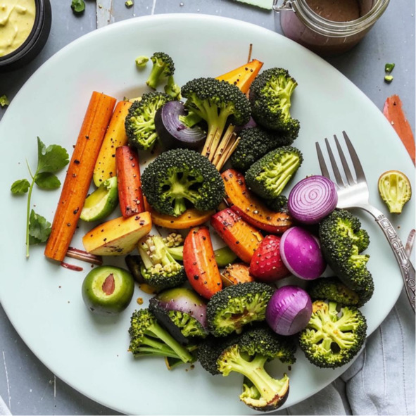 Разогрей духовку до 200° C. Нарежь все овощи и уложи их на противень. Заправь оливковым маслом и специями, перемешай. Запекай 25—30 минут. Перед подачей полей тахини и лимонным соком.