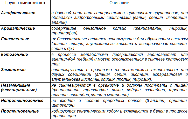 В основу современной классификации аминокислот положено химическое строение их радикалов. Согласно это классификации протеиногенные аминокислоты делятся на 3 группы: гидрофобные, гидрофильные (незаряженные, отрицательно и положительно заряженные) и амфифильные.