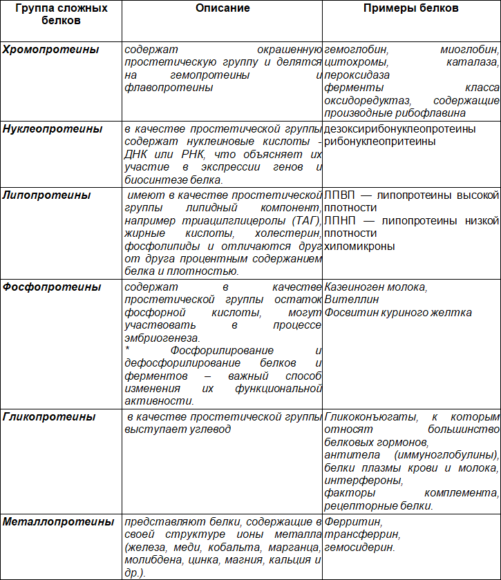 Белки условно подразделяют на простые (при гидролизе образуют смесь аминокислот) и сложные, или конъюгированные (состоят из белкового и небелкового компонентов). В качестве небелковой части (простетической группы) сложных белков могут выступать различные химические соединения, что находит отражение в классификации данной группы биологических соединений.